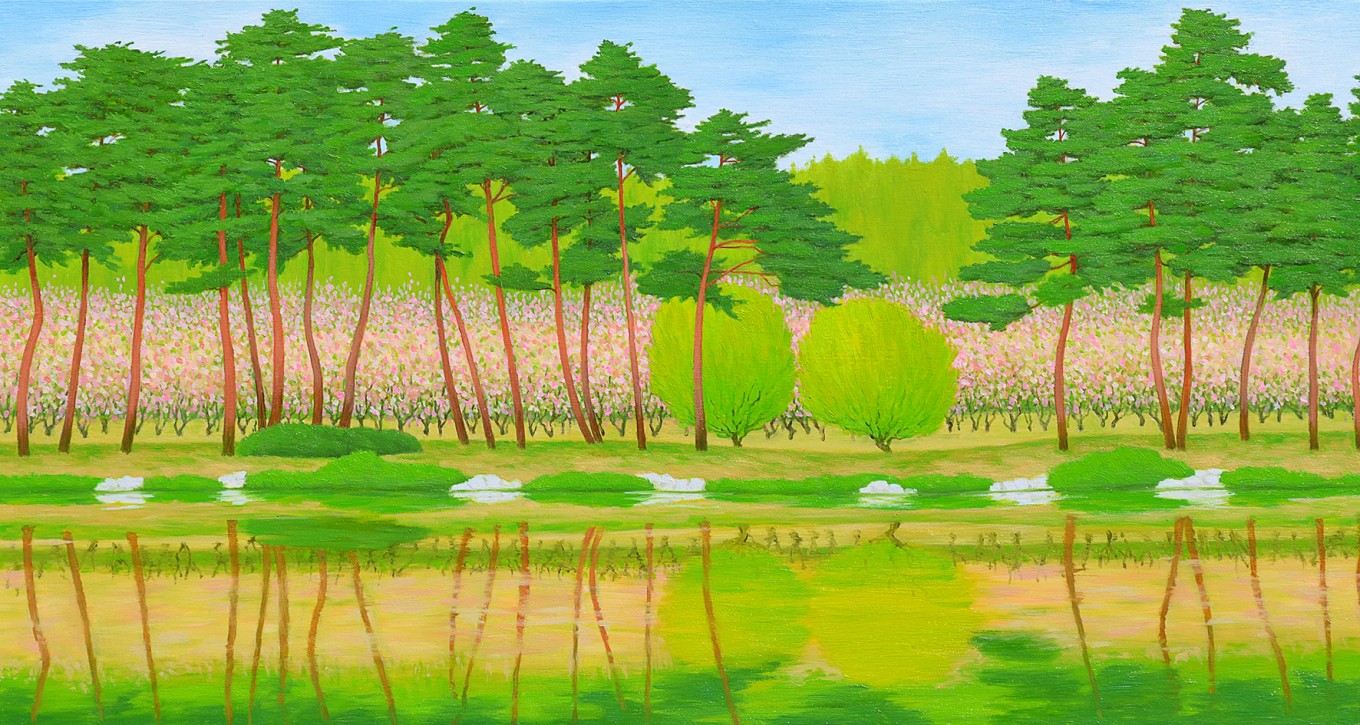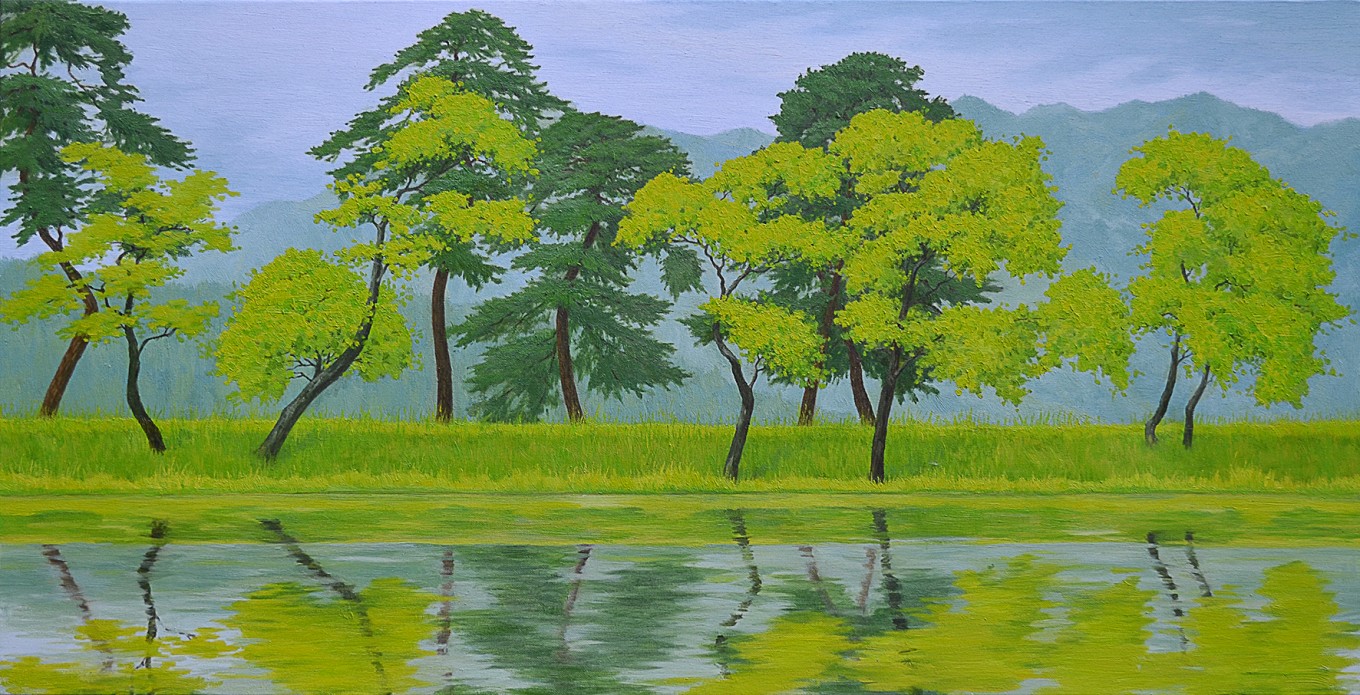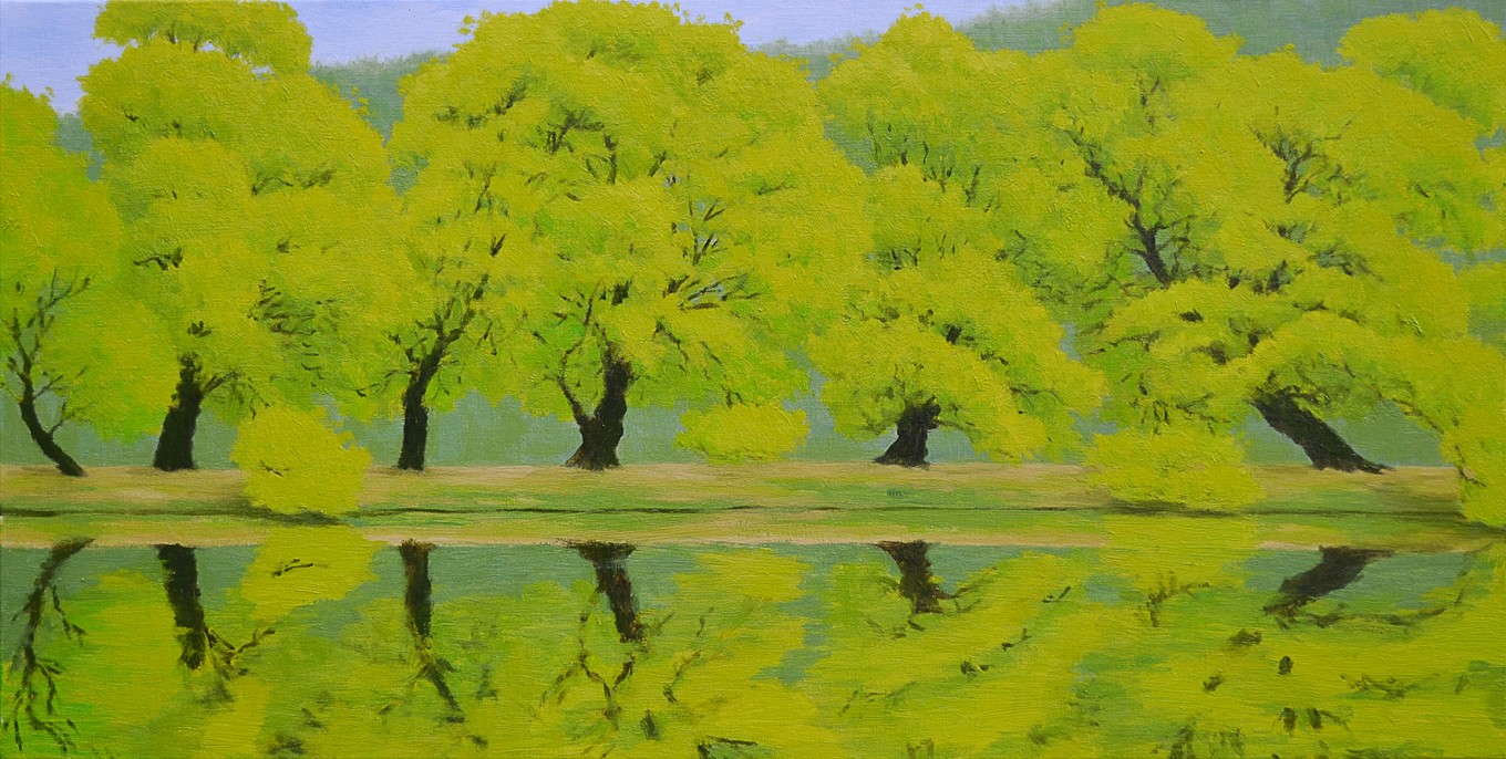 둘째는 물의 반영(反影)이다. 어릴 적 친구와 대나무를 잘라 낚싯줄을 메어서 강가에 나가 낚시를 하곤 했다. 그러나 커가면서 학업 때문에 자연스럽게 멀어졌고, 대학 졸업 후 낚시를 잊고 살았다, 그런 어느 날 대학 선배와 낚시를 같이 가게 되었고 낚시를 다시 시작했다. 일상의 피곤한 생활과 스트레스를 낚시로 풀어갔다. 그런데 어느 순간 낚시는 물고기가 아닌 그림의 소재를 찾기 위한 낚시로 변해가고 있었다. 잔잔한 물가의 반영된 수목들은 나로 하여금 그림으로 표현하게 만들었고 그렇게 지금의 “반영”은 시작되었다. 대구를 중심으로 근교에 있는 저수지는 낚시를 가기 위해서가 아닌 스케치를 위해 찾아 나선다. 이름도 모르는 낯선 저수지에서 내가 그리고자하는 풍경을 찾아다닌 지 십여 년은 족히 된 듯하다. 이제는 낚시가 아닌 작품의 소재를 찾아서 아름다운 무명 소류지를 찾아다니고 있다. 본 출품작은 경산시 소재의 반곡지 버들의 반영을 그린 것이다.