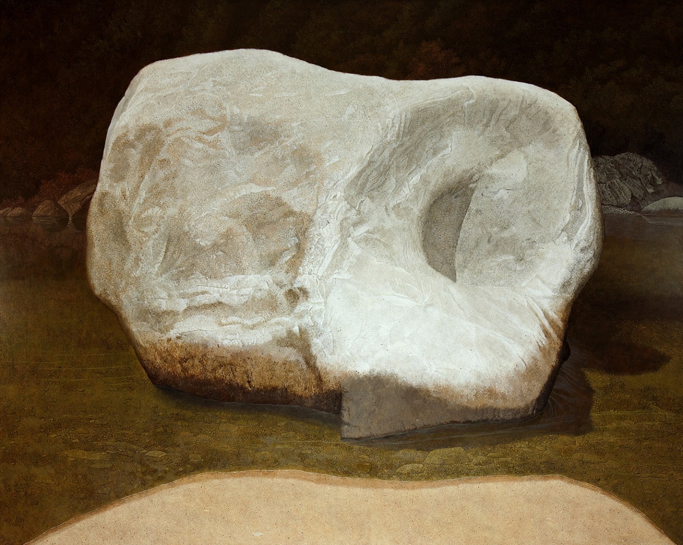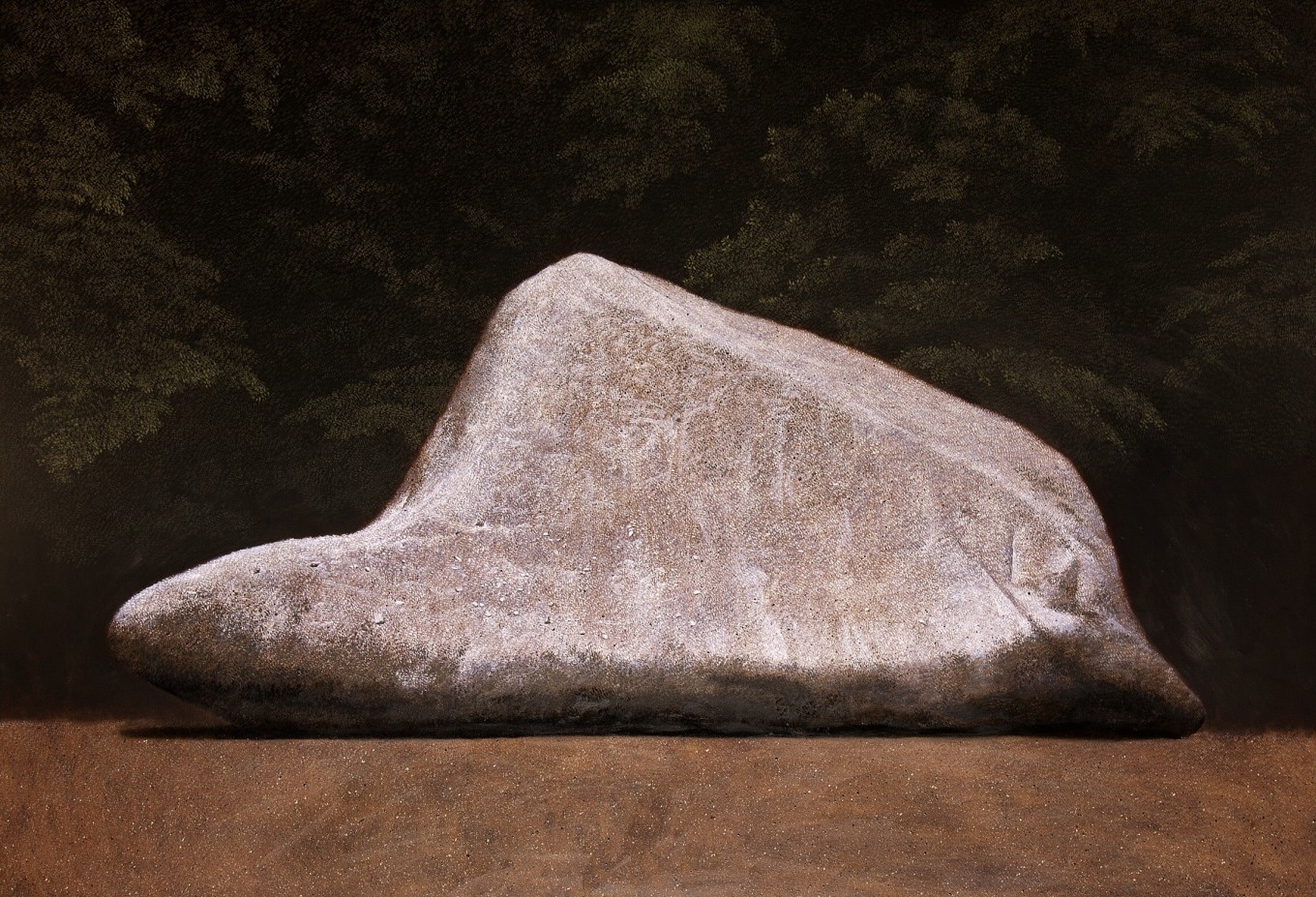 곽현석은 수고스레 많은 시간을 들여 만족할 만큼 점을 올리고 또 올린다. 그렇게 올린 점이, 그의 기준에서 대상의 본질에 근접할 때까지 그는 멈추지 않는다. 한마디로 곽현석의 작품은 지구의 지층을 빼닮았다. 작은 알갱이들이 퇴적되어 긴 시간에 걸쳐 단단히 굳어진 지층은 암석이 되고, 다시 쪼개어져 바위가 된다. 주로 인물을 그려온 곽현석이 인물이 아닌 대상으로 빈번히 작업해온 바위는 이렇게 그가 구사하는 유화기법과 절묘하게 연결된다. 그는 마치 바위를 이루는 모든 입자를 기필코 밝혀내겠다는 듯이 점(색)을 구축하고 있다.