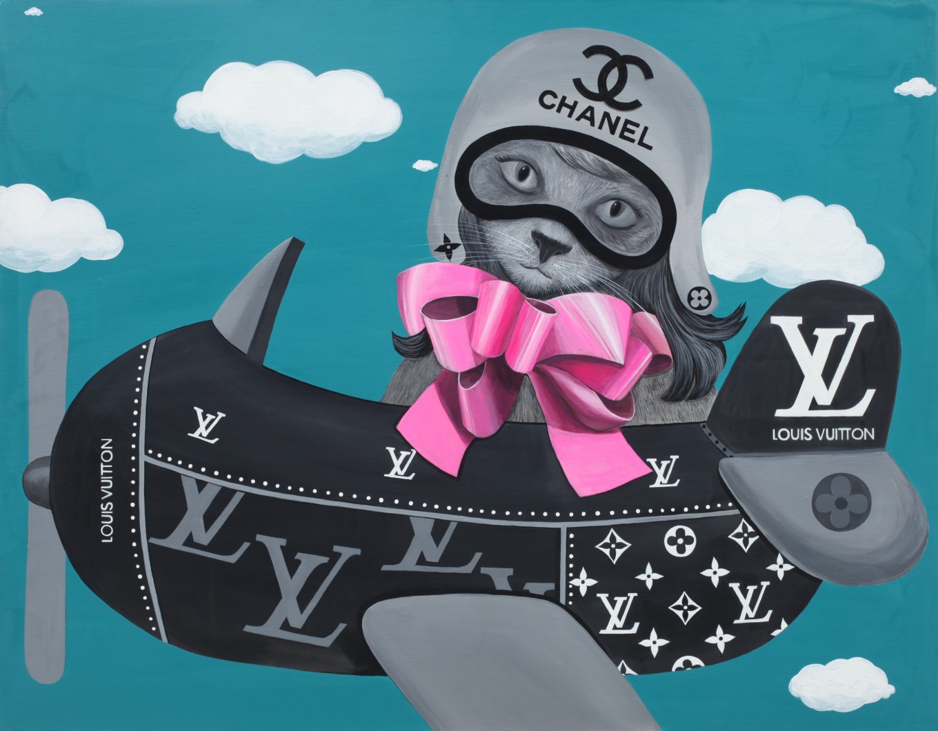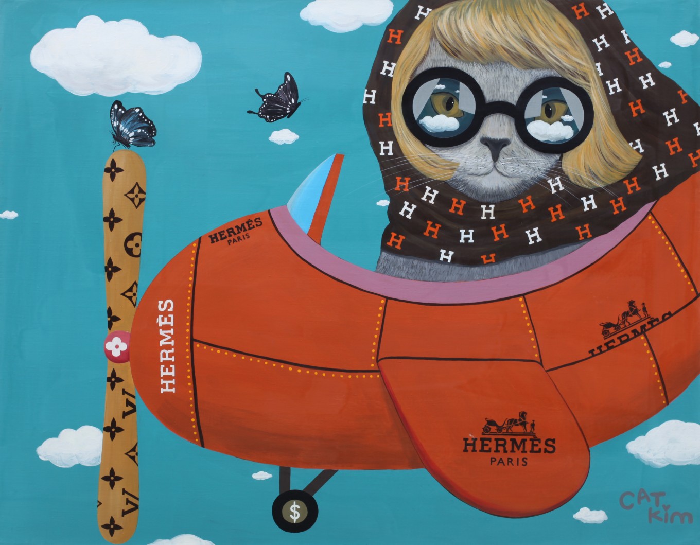 김시원 작가는 동그랗게 눈을 뜨고 관람객을 바라보는 고양이를 그린다. 샤넬, 에르메스, 루이비통 같은 누구나 알만한 로고가 박힌 명품으로 몸을 치장하고, 선글라스를 끼고 있는 고양이들이다. 고양이는 금발의 머리카락을 곱게 빗어 내린 후, 배와 비행기를 타고 어디론가 떠나가고 있다. 그가 느끼는 행복을 상징하기라도 하듯 꽃과 나비가 고양이를 감싸고 피어난다. 분홍과 하늘, 보라색 등의 단색으로 색칠된 배경은 이 모든 것이 환상 속의 이야기라는 것을 은근히 알린다. 캔버스 속 모든 요소들은 복잡하지 않고 더 없이 분명하다. 작품은 소소하지만 확실한 행복을 지금 당장 부여잡으라고 우리를 유혹한다.