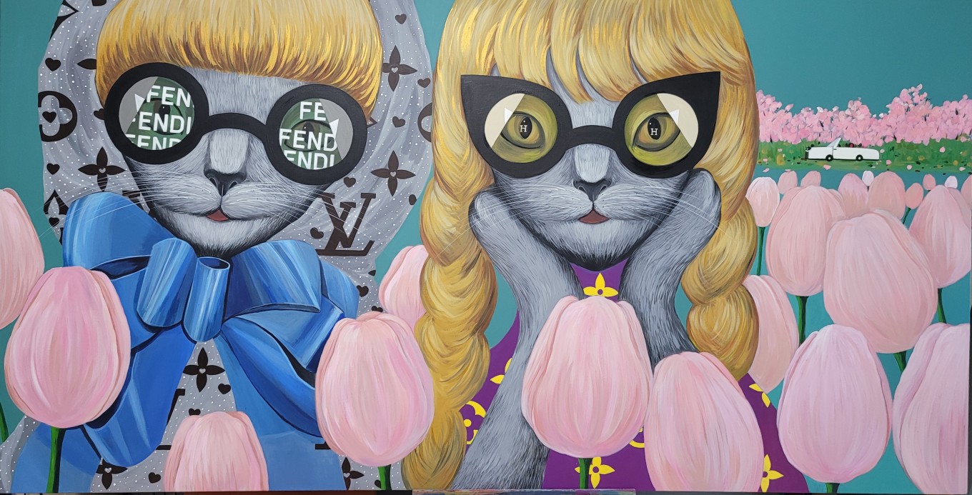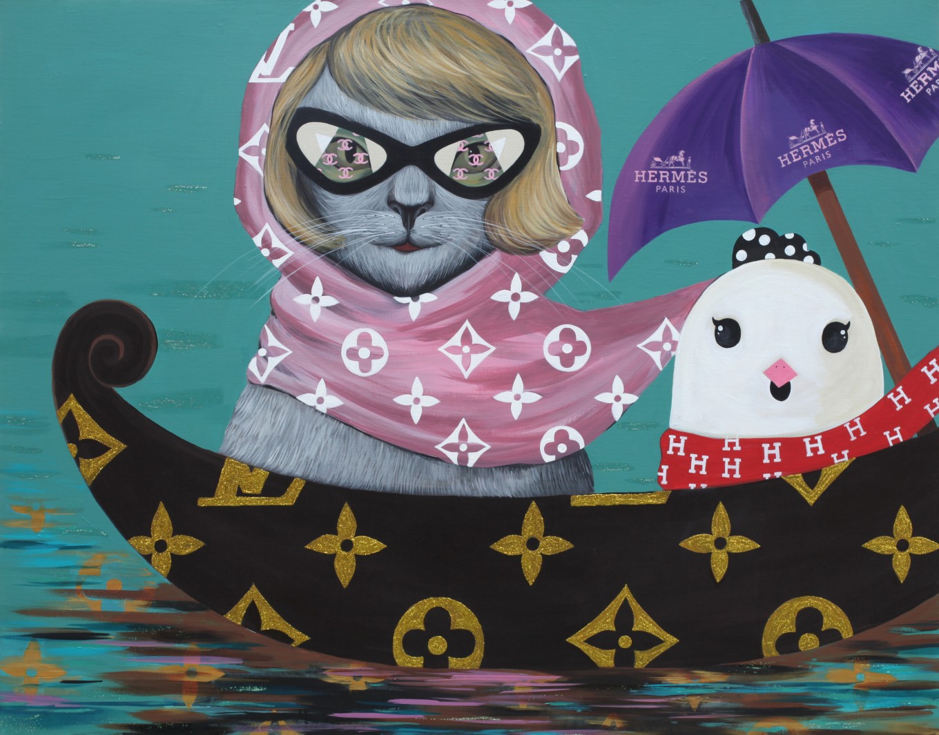 작품 속 고양이는 서로의 외로움을 핥아주듯 두 마리가 짝을 이루고 있을 때도 있지만, 대부분은 홀로 얼굴만 강조되어 캔버스의 중앙을 차지하고 있다. 여러모로 셀카가 떠오른다. 이 고양이는 작가 자신의 페르소나(사회적 자아)를 보여주는 자화상이다. 전통적으로 화가의 자화상은 자신의 내면을 솔직하게 고백하기 위한 자기 성찰의 용도로 활용되기도 했지만, 사회에서의 위치(계급)와 자신감을 드러내기 위한 수단이기도 했다. 작가는 화려하게 치장하고, 마치 사람인 양 포즈를 취하는 고양이를 그리며 은연중 사람들이 바라보는 자신의 이미지를 그린다. 패션을 통해 스스로를 표현하는 것에 능숙하고, 화려하기 그지없는 아름다운 모습이다.