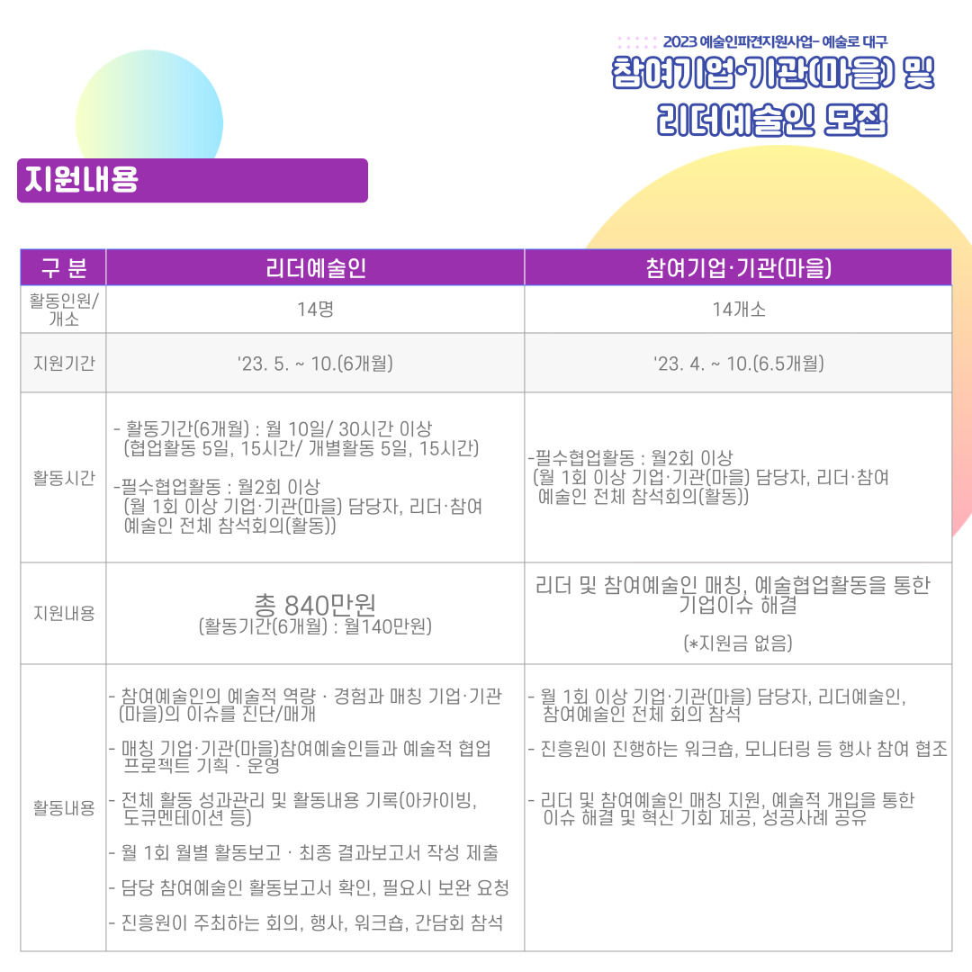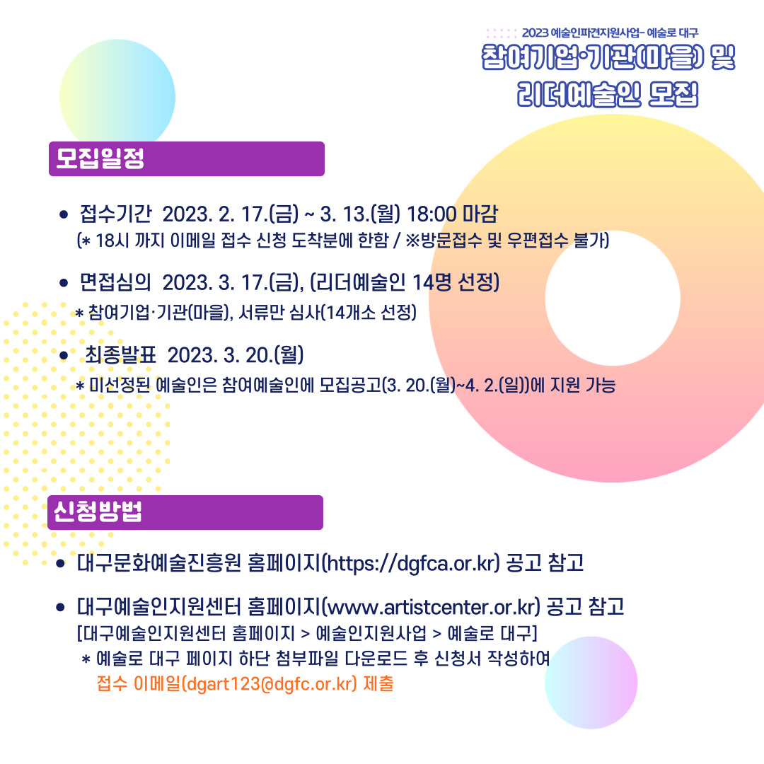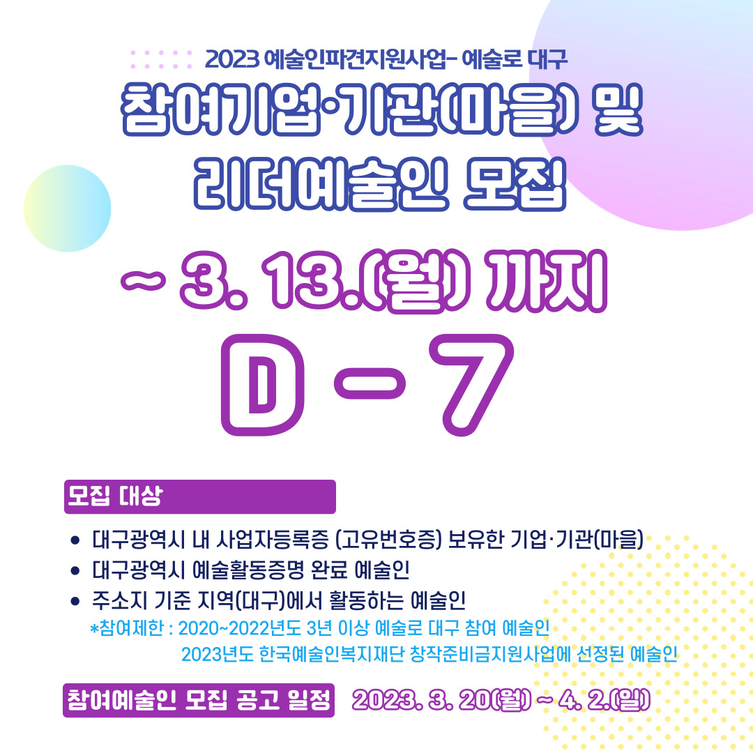 종료 [2023 예술인파견지원사업-예술로대구] 참여기업·기관(마을)및 리더예술인 모집기간 3월 13일(월)까지