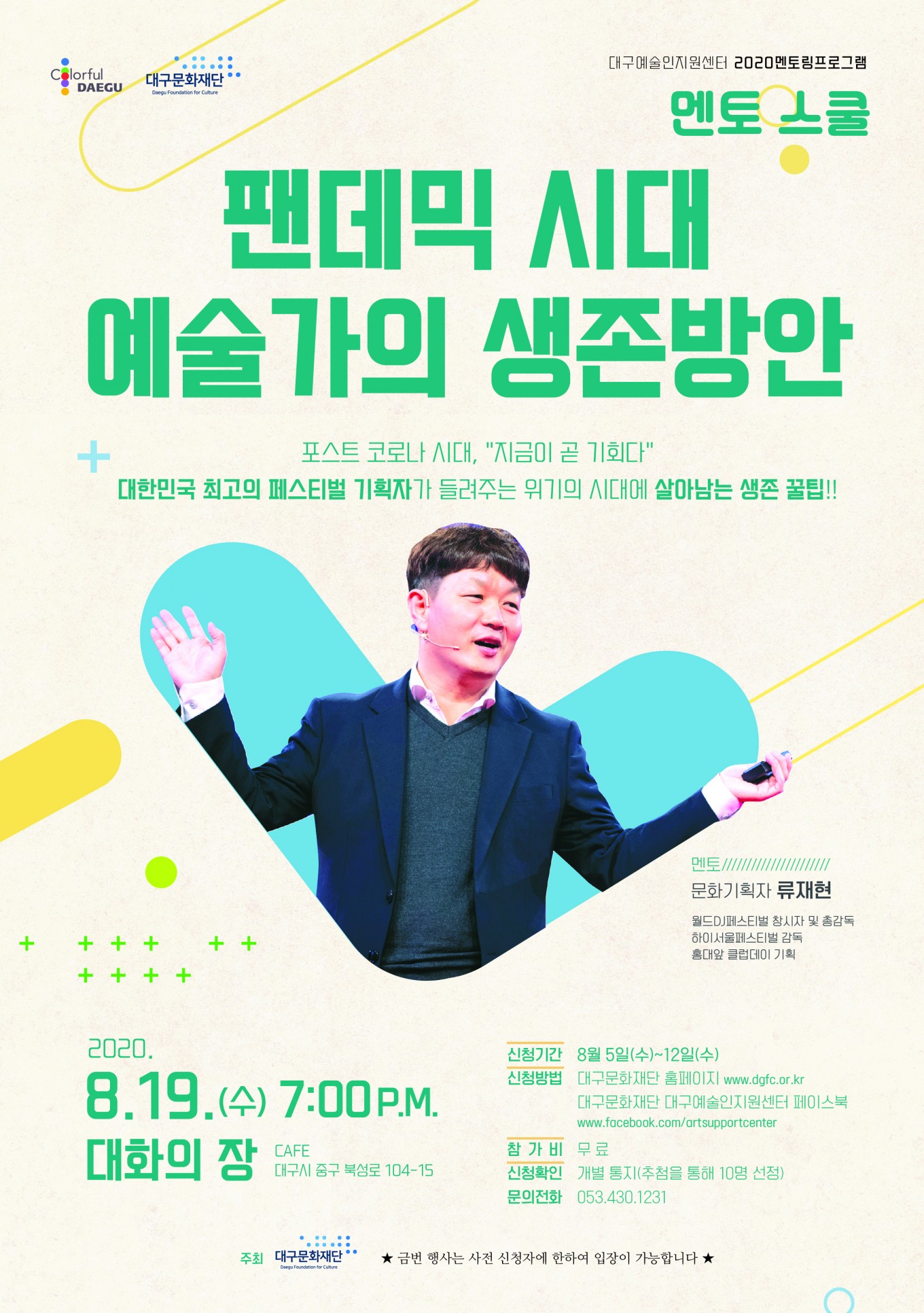 (재)대구문화재단 예술인지원센터는 문화예술현장에서 다양한 형태로 활동하는 멘토단을 구성하여 예술이 현장에서 어떻게 적용되고 활용되는지를 공유하고, 예술인 네트워크를 기반으로 개인예술가 역량강화와 성장구조를 조성하고자 멘토스쿨을 운영합니다. 관심 있는 예술인들의 많은 참여바랍니다. 2020년 8월 5일 (재) 대구문화재단 대표 |